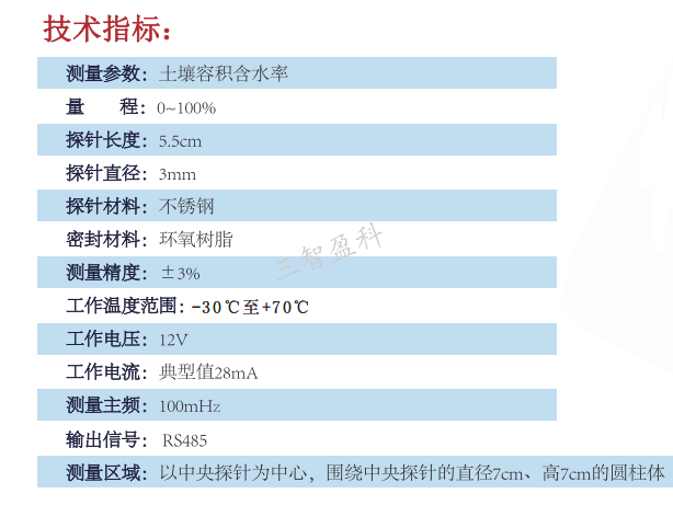 - 描述: 土壤水分传感器是基于介电理论并运用频域测量技术自主研制开发的,能够精确测量土壤和其它多孔介质的 体积含水量。可与温室环境监测、土...